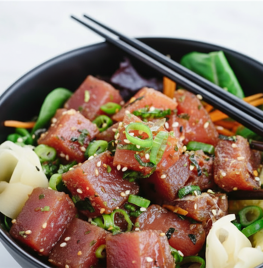 Ahi tuna is the star of this dish. Its naturally rich flavor pairs beautifully with sesame, soy, and a hint of sweetness.