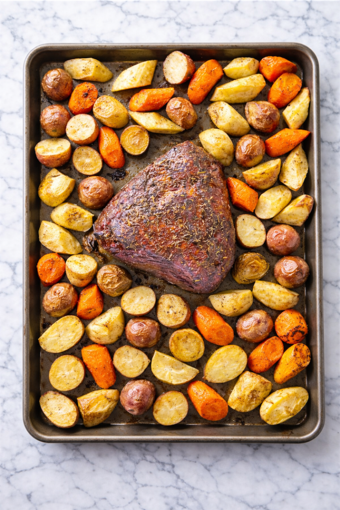 I make this on busy weeks or low-energy days because the ingredients are straightforward and the oven does most of the cooking. The potatoes crisp gently, the carrots soften and turn slightly sweet, and the corned beef warms until tender and savory. It’s comforting without any fuss.