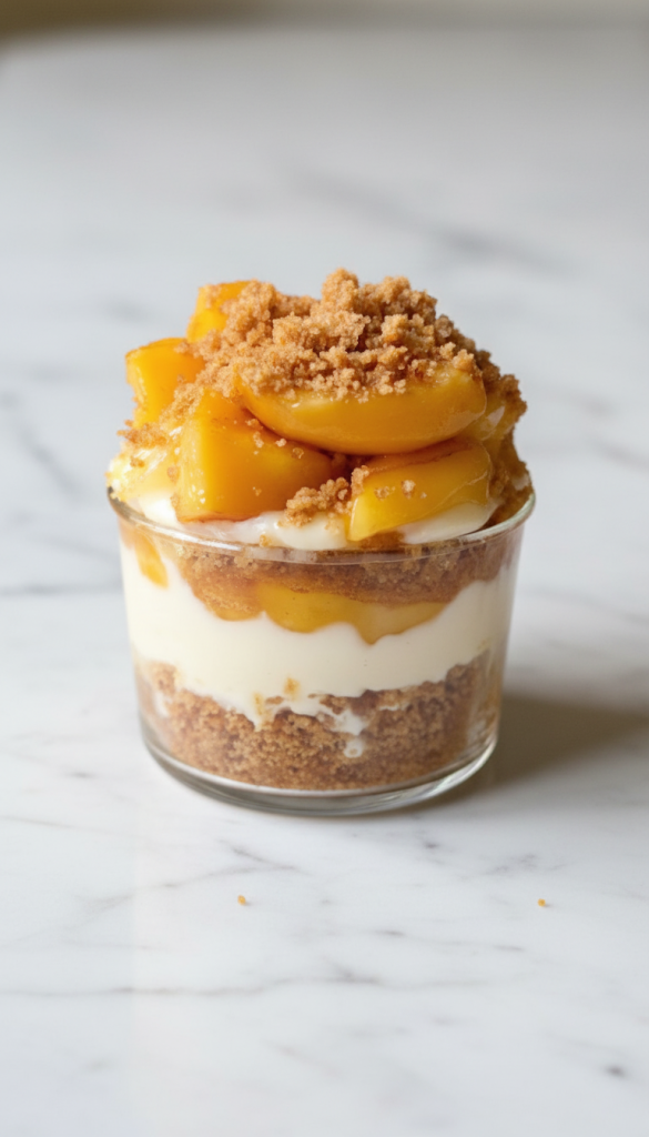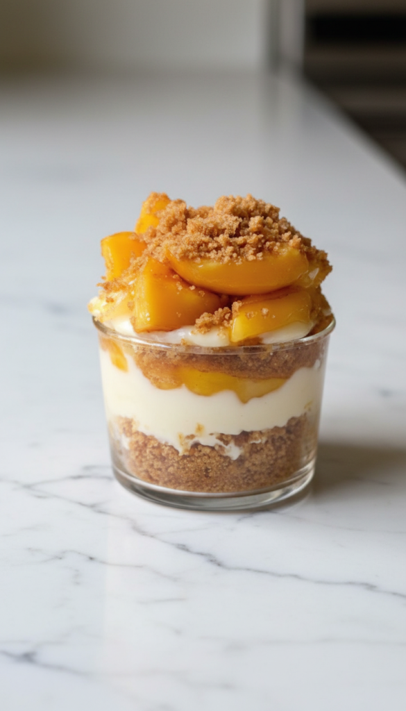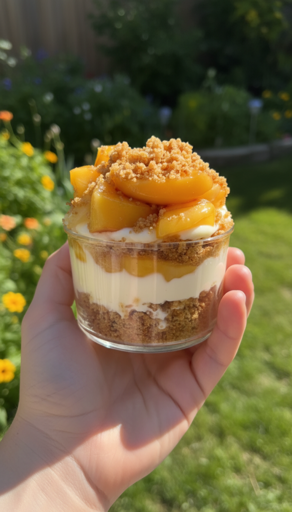 The whole idea here is simple: build layers of buttery graham crust, smooth cheesecake filling, and a cozy peach cobbler topping. No slicing, no fuss. Just grab a spoon and dig in.