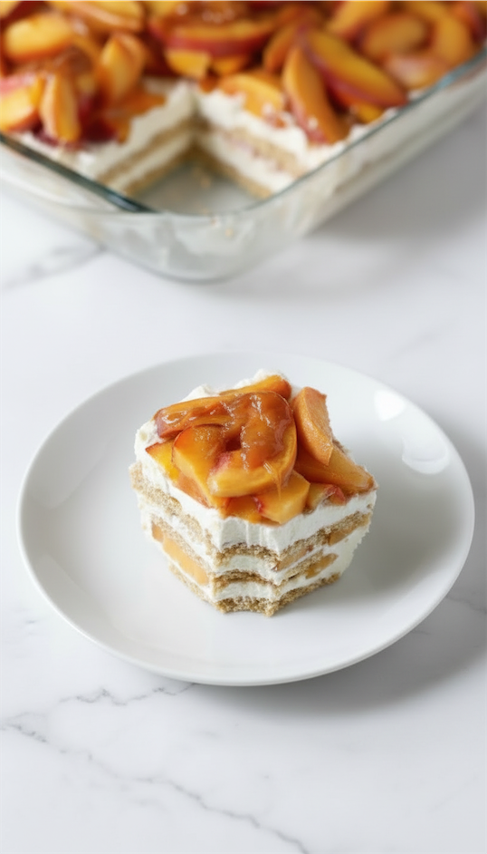 A creamy, no-bake dessert layered with whipped cream, tender peaches, and softened graham crackers that transform into a cake-like texture. Finished with a smooth caramel drizzle for added richness.